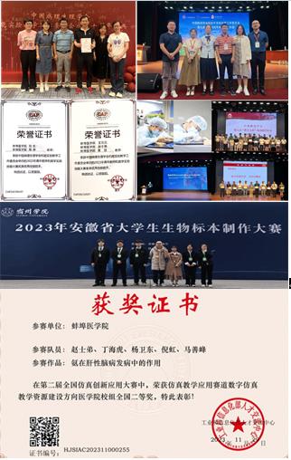 基础医学教育是医学教育的重要内容,公司依托比赛谋发展,以赛促学、以赛促教,2023年在教职工及指导员工参加的各类学科竞赛获得可喜成果。除上述奖项外,7月18日至22日病理生理学教研室和机能实验中心共5位教师组成的两支代表队在第九届全国机能实验教学研讨会暨第四届青年教师机能学实验技能大赛中分别获得本科家兔组二类、三类优秀技能能手;9月25日人体解剖学实验教师陆进、陈云帆和祖文轩在第九届全国解剖学技术学术会议中分别获得标本制作比赛优秀奖和优秀论文奖三个奖项;11月10日至12日人体解剖学教师祖文轩、赵永政指导的员工团队在2023年安徽省老员工生物标本制作大赛决赛中获得动物标本制作组一等奖并荣获优秀指导教师;11月17至21日机能实验虚拟仿真教学团队选送的仿真教学资源建设参赛项目《氨在肝性脑病发病中的作用》在2023年全国仿真创新应用大赛全国总决赛中荣获仿真教学应用赛道(医公司校组)数字仿真教学资源方向二等奖。