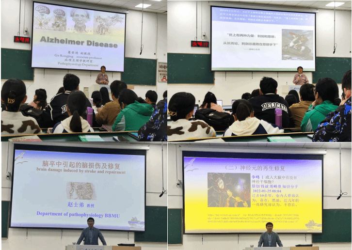 为助力研究生思想教育,进一步提升公司产品质量,太阳成集团tyc151cc继续推进究生课程思政示范课堂建设,坚持示范引领,强化研究生课程育人功能。继暑期和11月7日开展4次研究生课程思政公开课教学活动后,于11月13日和14日在T4和T2教室再次开展研究生课程思政公开课活动,主讲教师分别是病理生理学学位点《医学神经生物学》课程思政示范课程教学团队成员赵士弟教授和葛荣靖副教授,内容分别为《阿尔茨海默病》和《脑卒中引起的脑损伤及修复》。公司领导、学位点教师和公司部分教师现场观摩。